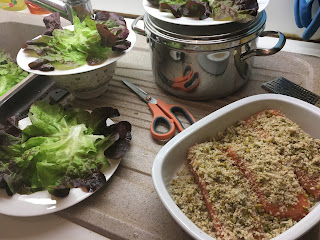 Vorspeise: Lachsfilet mit Pistazien-Kruste auf einem Bett aus Salat