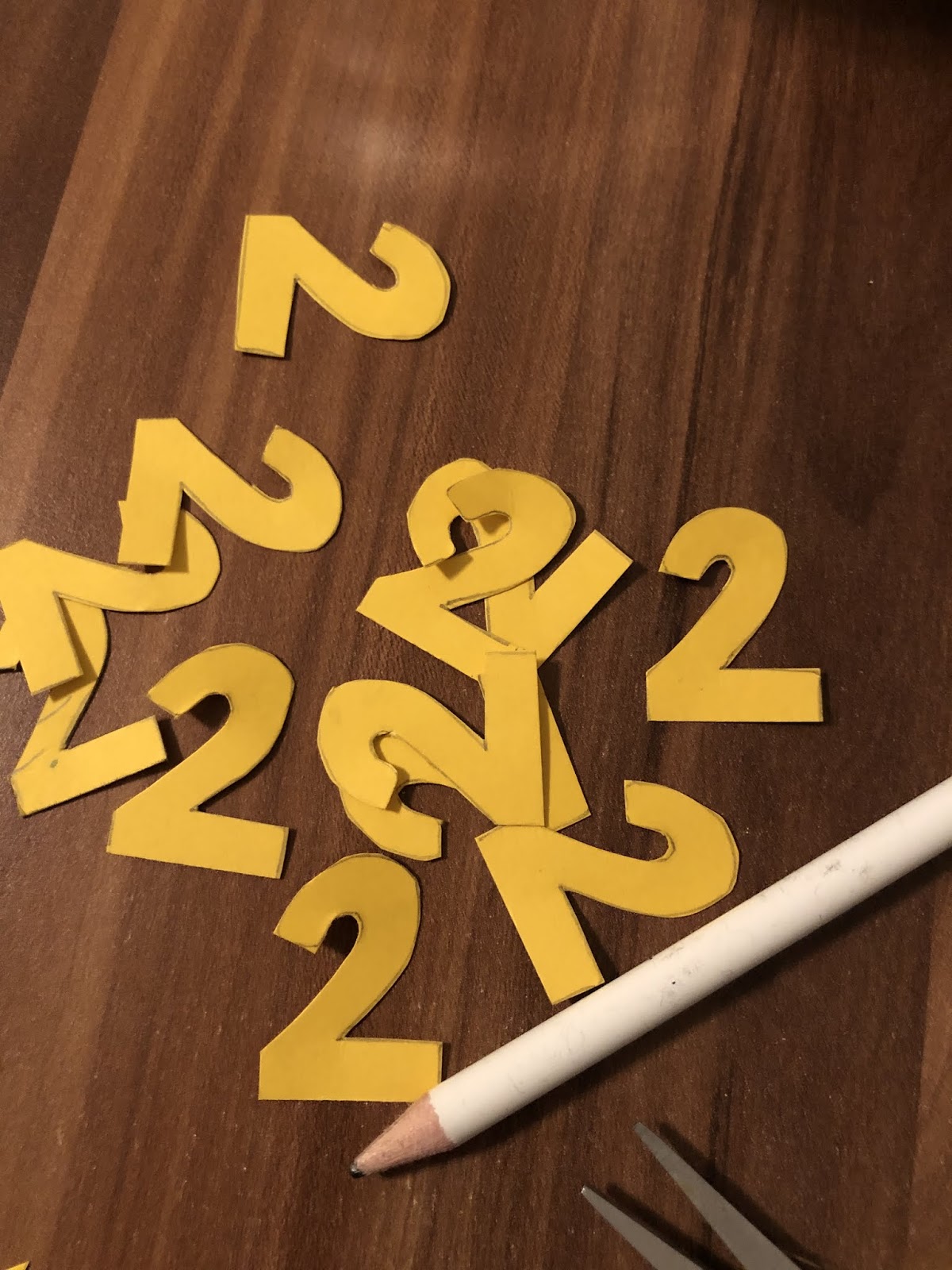 Der glitzernde Schriftzug 2020 ist frei Hand gezeichnet und ausgeschnitten. Die Zahlen sind nicht alle gleich groß, aber durch das viele Glitzer fällt es nicht auf.